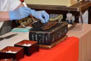 鰻は皆様の目の前で炭火で焼いて、調理過程を目でも楽しんでいただきました。