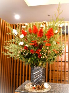 フロントに来られた方からは『ヒバの香りが良いわね』や『ボリュ-ムが有って華やかね』『クリスマスらしいわ』とのお声を頂いております。
