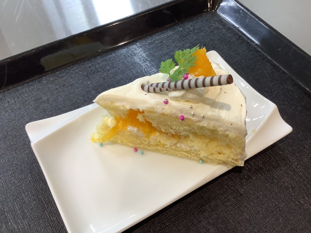 当館の料理人のお手製の、バースデーケーキ(マンゴーケーキ)と