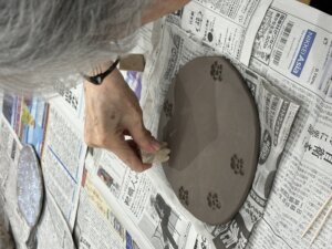 お皿を選んだ方は、スタンプを押すように木の型を土台に押し付けていきます。