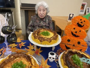 当施設の料理人が心を込めて準備したハロウィン仕様の手作りケーキで