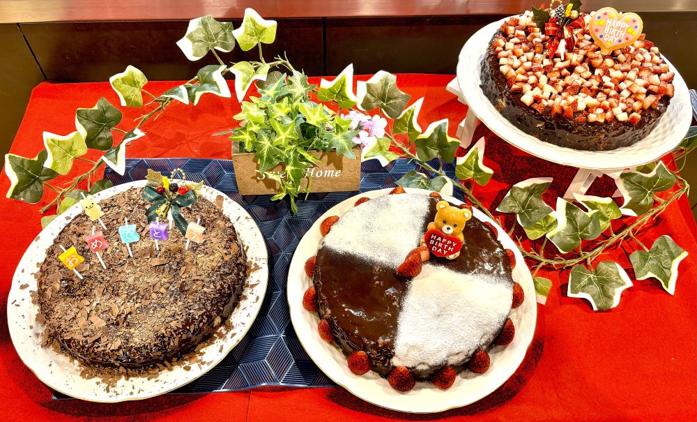 当ホームの料理人が心を込めて手作りした特製チョコレートケーキは、イチゴでデコレーションされて とっても可愛い仕上りでした