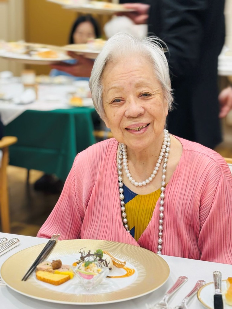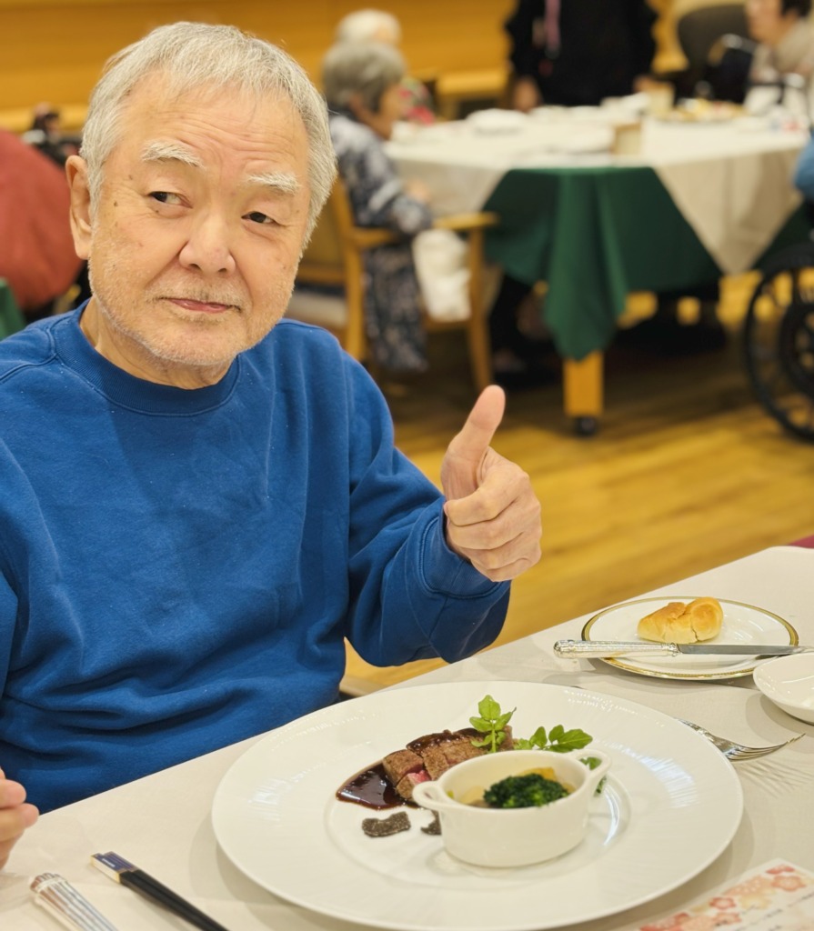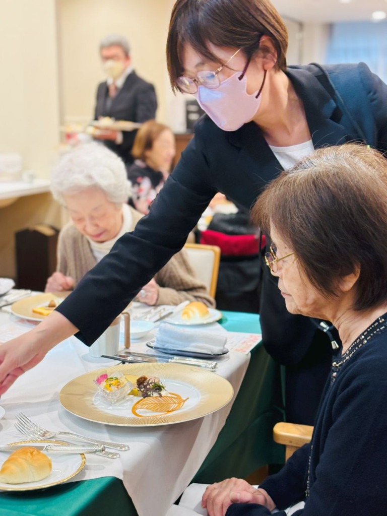 素敵なお召し物に、背筋を伸ばしてナイフとフォークをお食事していただき