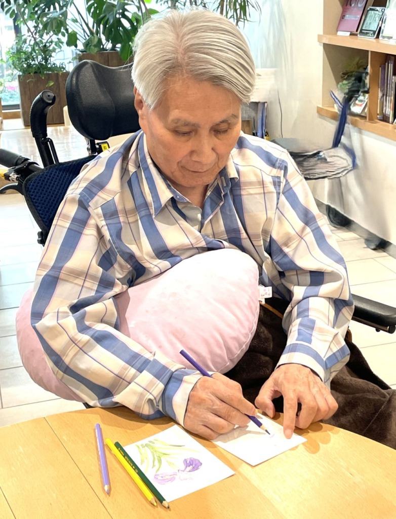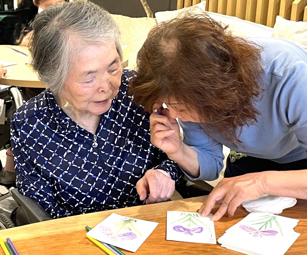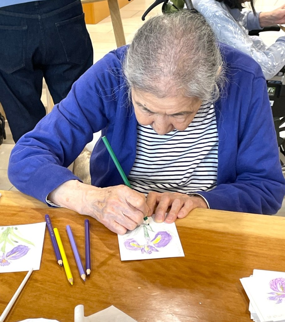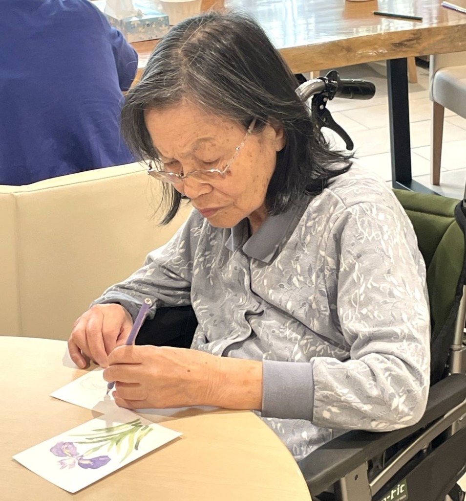 初夏の柔らかな日差しが差し込む午後、絵手紙教室を開催いたしました。今回の題材は、この季節を彩る花「花菖蒲」。