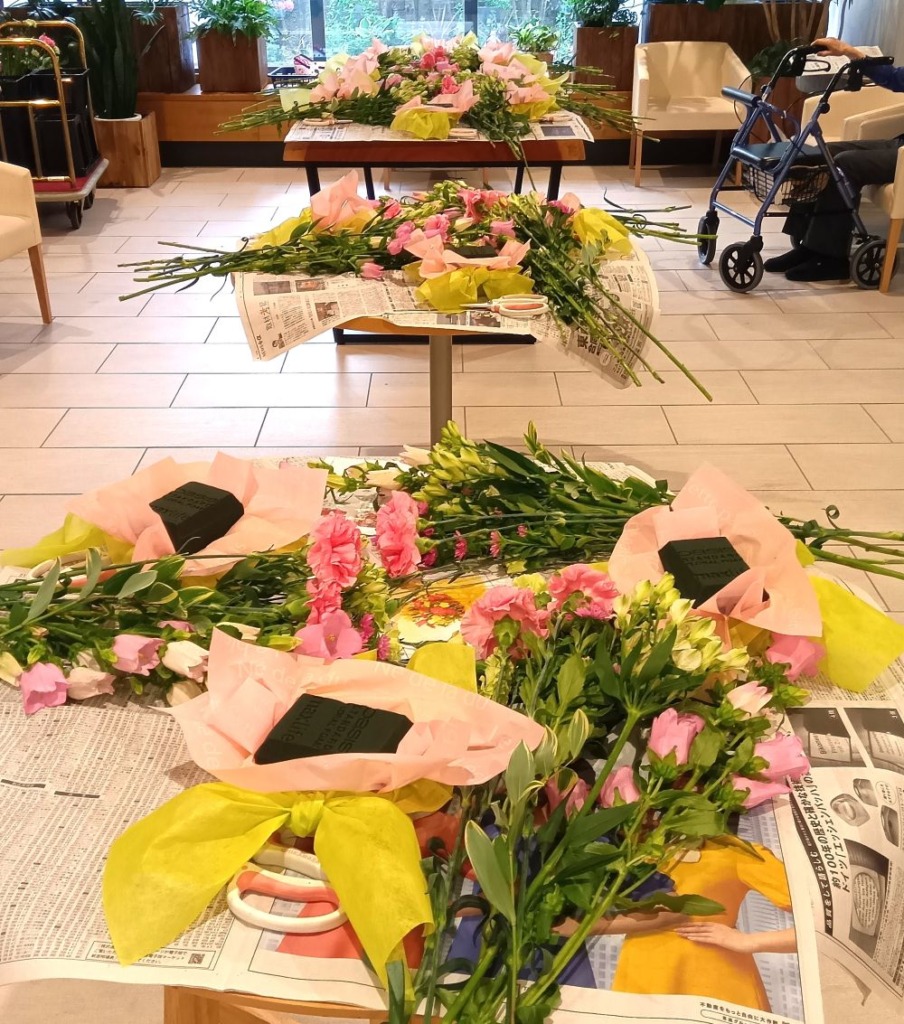 お花の方は、カーネーション(感謝.気品)、アスター(変化)、スプレーカーネーション(純粋な愛.感動)、ナルコラン(元気を出して)、カンパニュラ(感謝)、アルストロメリア(持続.未来へのあこがれ)、ヒペリカム(煌めき) と、様々な 黄色や白、ピンクのお花が用意されました。