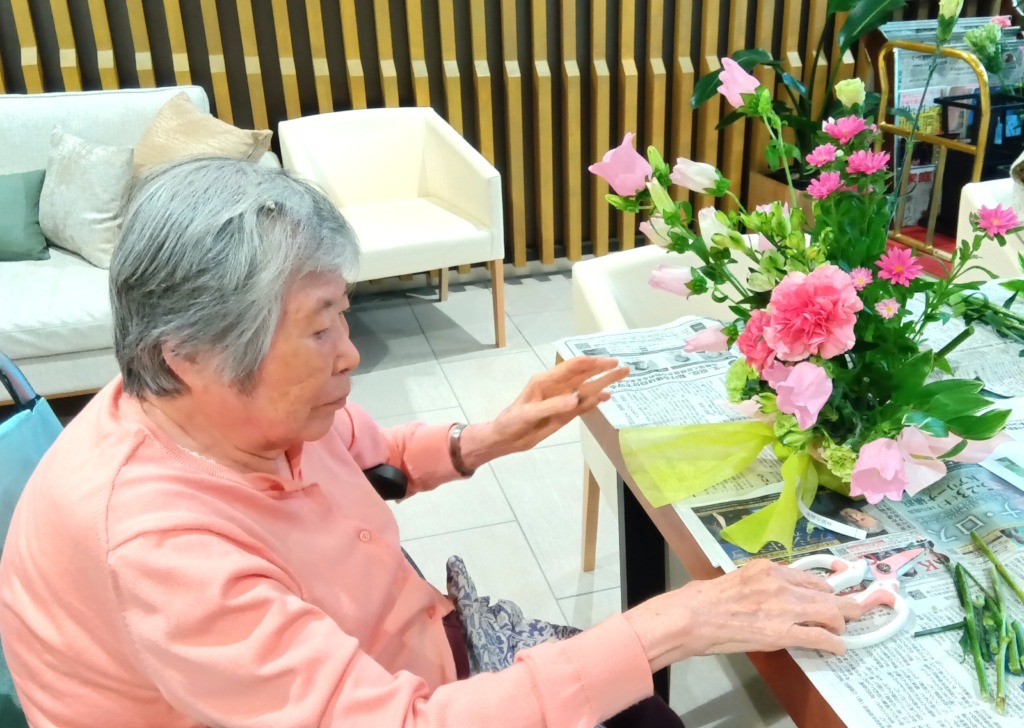 みなさま、それぞれの感性で茎を切って長さをきめていきますが、、、なかなか難しいご様子です。
