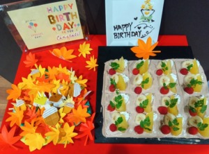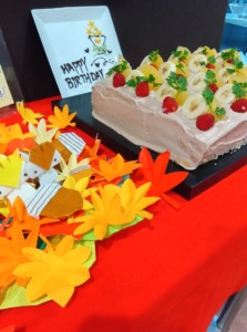 折り紙で作った落ち葉の色合いが鮮やかです。かわいいリスさんもお祝いにきてくれました。