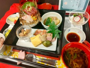 鮪の角煮、だし巻き卵、金目鯛塩麹焼き、独活胡麻和えなど数々の前菜、筍や菜花や蕪の入った煮しめ、ズワイ蟹の寄せ蟹酢、赤飯など種類豊富でございます。最後に食前酒(ノンアルコール)を添えて完成でございます。