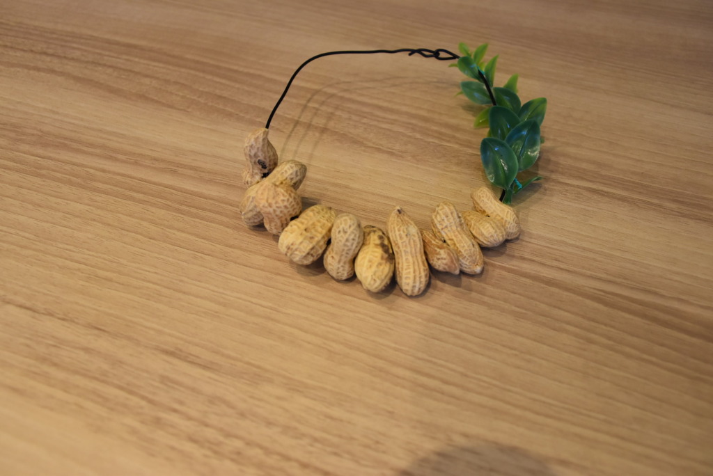 ピーナッツリースは森に餌が少なくなる12月から3月頃の鳥たちの楽しみです(^▽^)/ワイヤーに穴を空けた殻付きピーナッツを通します。ピーナッツの両端はカットし、鳥が突きやすいようにします。