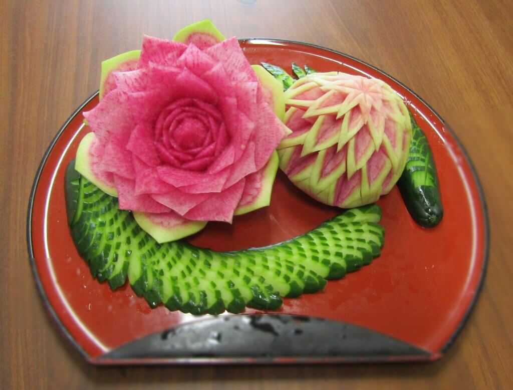 普段、東館で皆さまにお食事を提供させていただいている中華料理出身の料理人が、今回、紅心(こうしん)大根と胡瓜を使った飾り切りを作ってくれました。