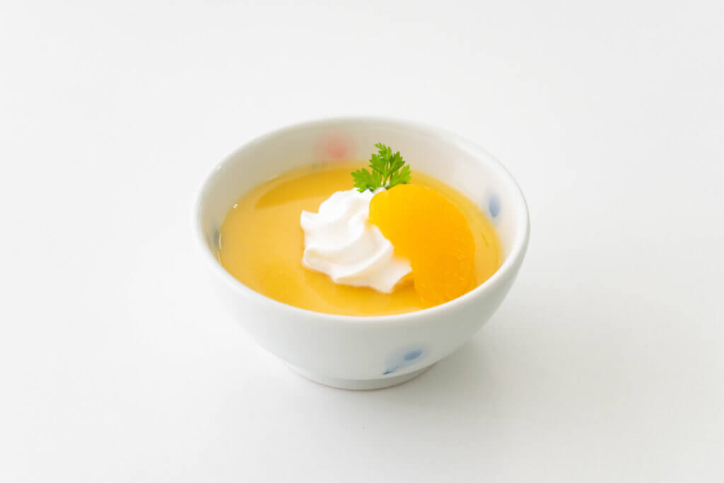 ~みかん果汁を入れたミルクプリンの上に、生クリームとみかん缶をのせ、さっぱりとしたプリンに仕上げました~