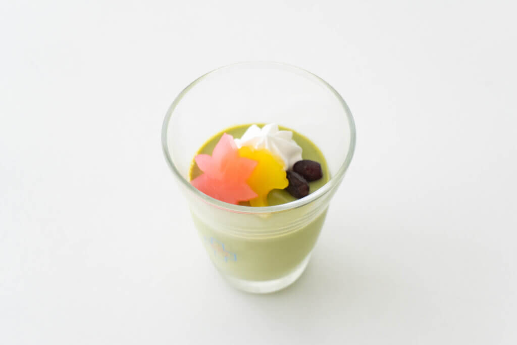 ~濃厚抹茶プリンの上に生クリームを絞り、イチョウとモミジを形どった羊羹を飾りました~