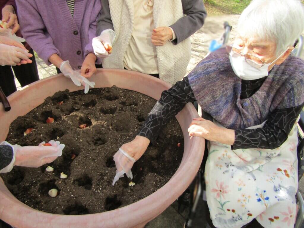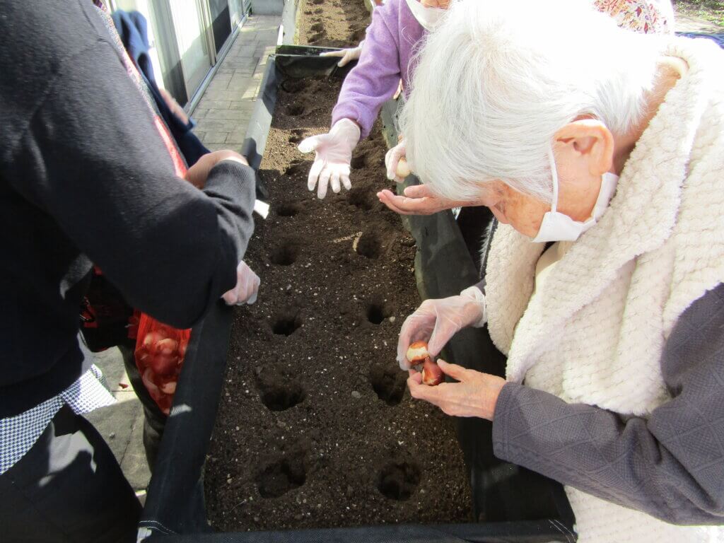 午後の心地よい日差しの中、今年も恒例のチューリップの球根植えを行いました🌷