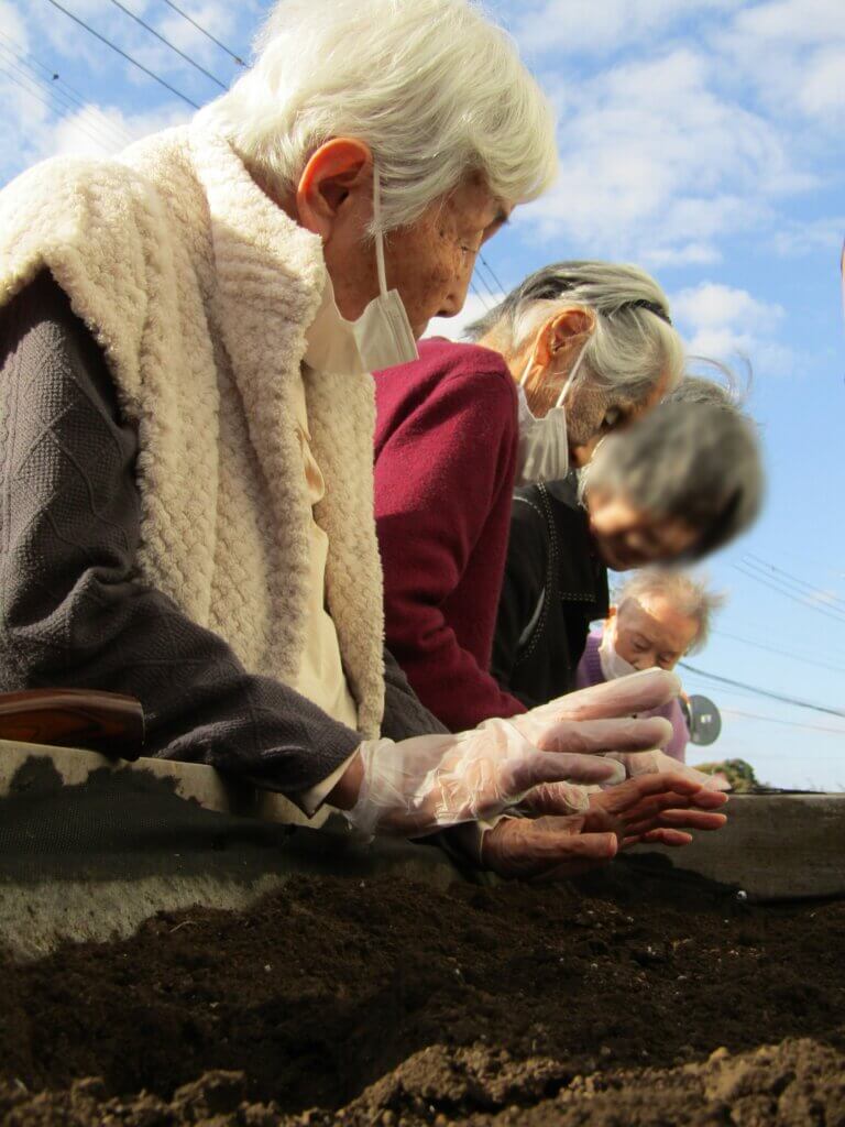 「昔はよく畑で野菜を育ててたのよ」と、慣れた手つきで土をならす方や、「このくらいの深さがちょうどいいのよ」とスタッフにアドバイスをくださる方も。