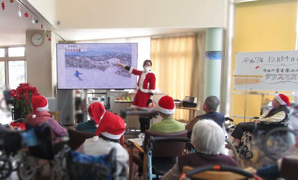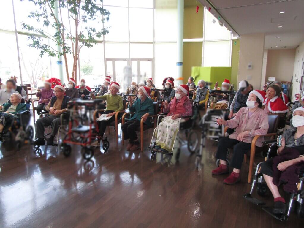 普段と違った雰囲気の中で、音楽を通して交流をもち、心豊かにお過ごしいただくため、たくさんのご入居者さまにお集まりいただきました😊