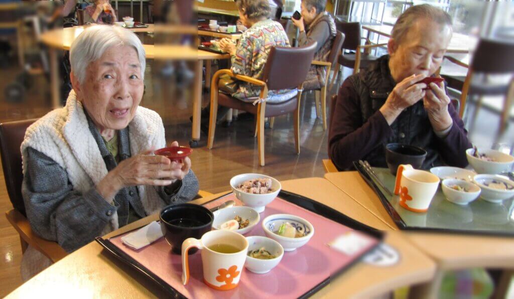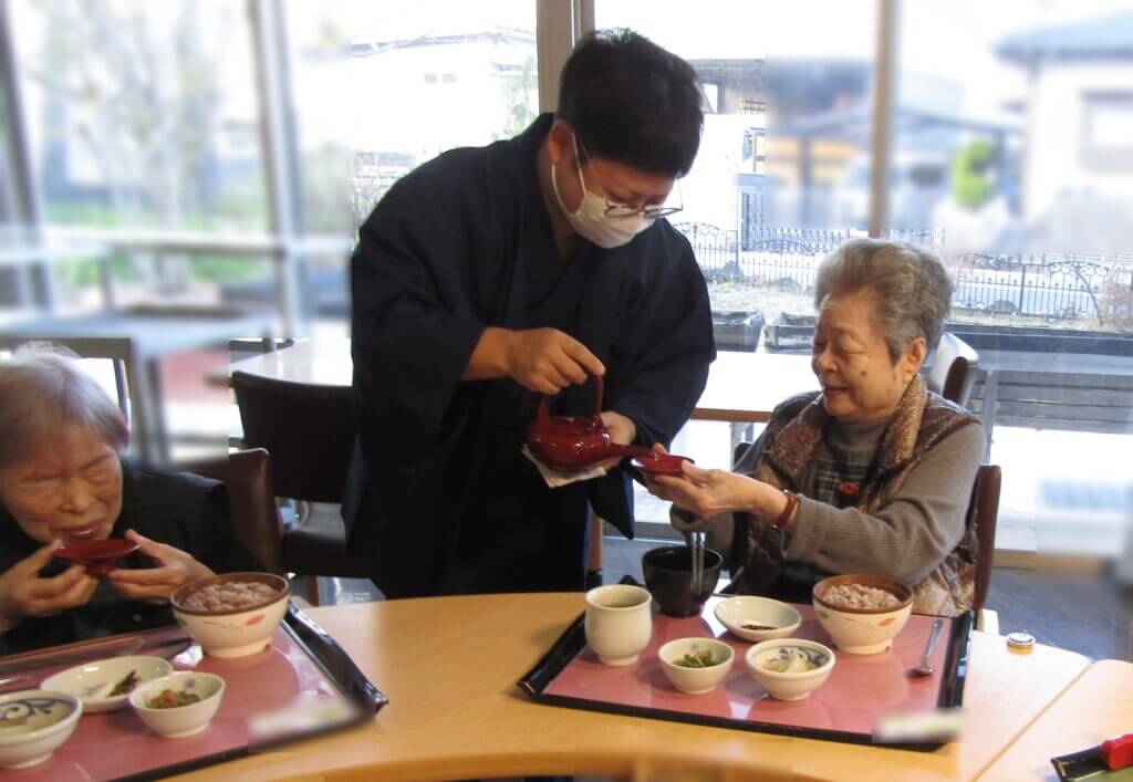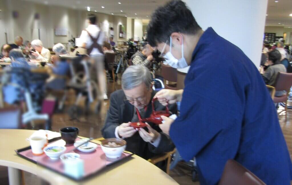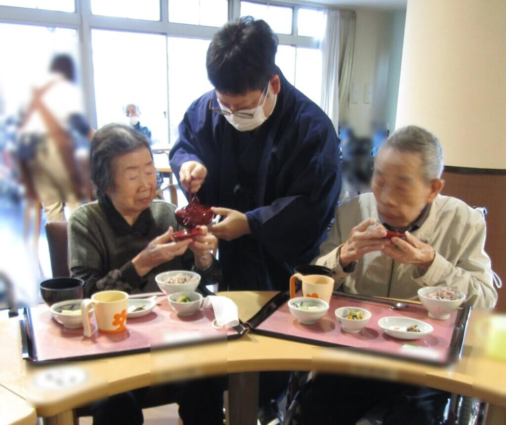 1月1日のお昼、新年をお祝いする「お節料理」と「お屠蘇(とそ)」が登場し、ご入居者の皆さまと一緒にお正月のひとときをお楽しみいただきました😊