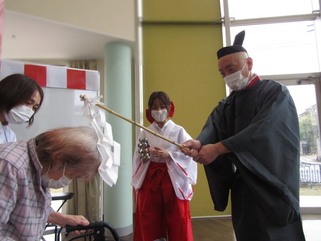 神主と巫女の衣装を職員が身にまとい、厳かな雰囲気の中で新年のご祈祷を執り行いました。