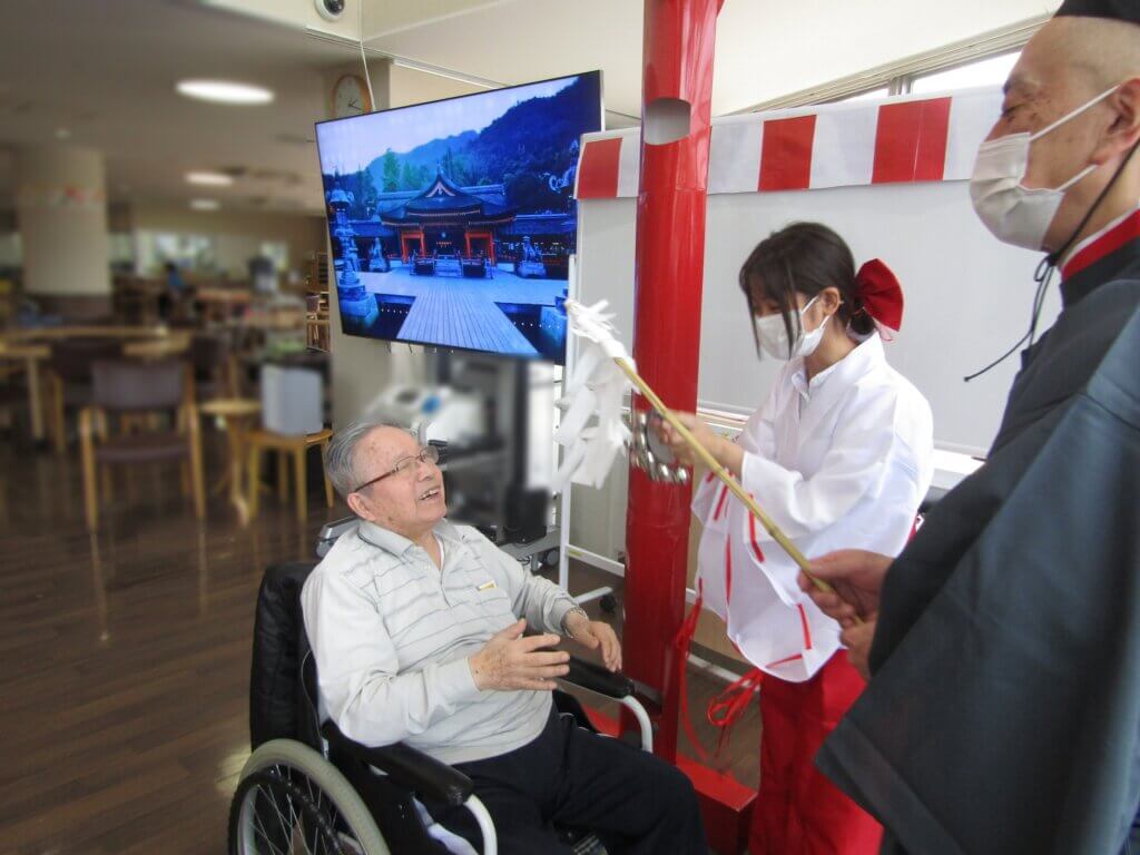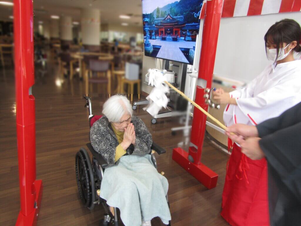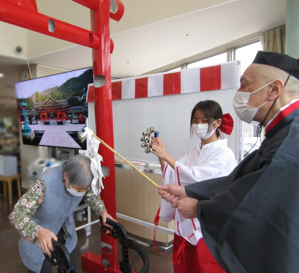 ご入居者の皆さまは、笑顔で手を合わせながら「健康で過ごせますように」「家族に会えますように」と、それぞれの願いを込めてお参りされていました。