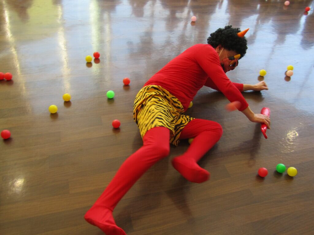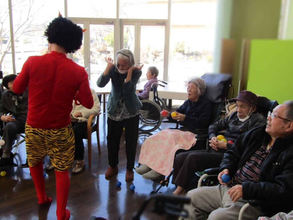 鬼が近づくと、ご入居者の皆さまは「それ~っ!」と元気よく豆を投げられ、鬼役の職員も逃げ回ります。
