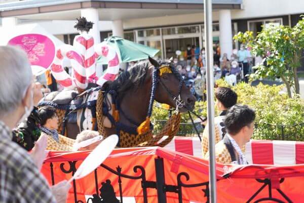 ホスピタルメント桜十字とさくら東館の間の道路に、太鼓やラッパの祭り囃子が響き渡ると、お客さまは手拍子をされたり、うちわを振って声援を送られたりと大盛り上がり。口取りの皆さんが巧みに馬を操ると、飾馬が右へ左へと動き、その迫力にひときわ大きな歓声があがりました。