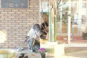 2023.12.18 スタッフブログ お正月支度 一段と冷え込み、冷たい風が吹く中、ホスピタルメント桜十字の門松作りを行いました。 作るのは庭の手入れをしている美花隊です。 毎年のことで、手際よく、華やかに組み立てます。 完成です! 毎年手作りの門松を入居者さま、ご家族さまに見ていただいてますが、今年も素晴らしい出来上がりとなりました♪ 門松が飾られると、もうすぐお正月を迎えるんだと実感できますね。 皆さまも良いお年をお迎えくださいませ。