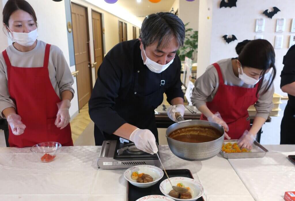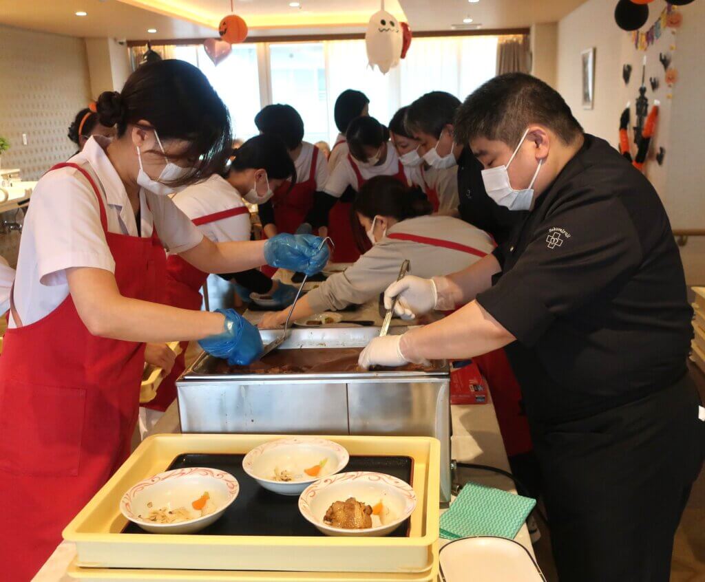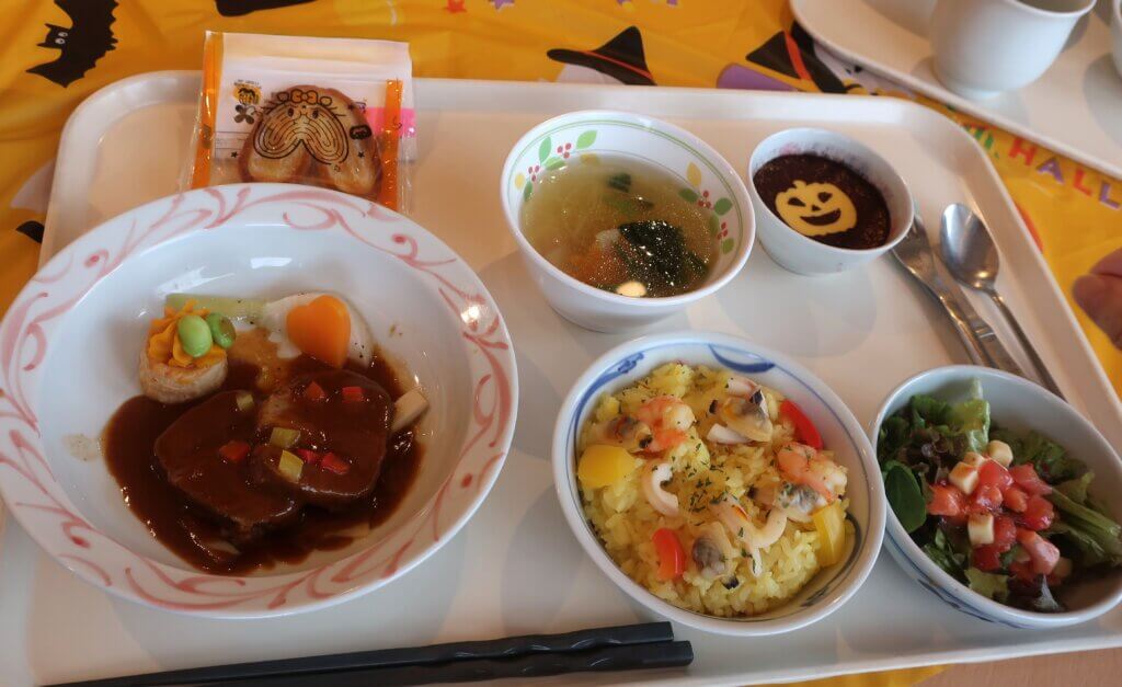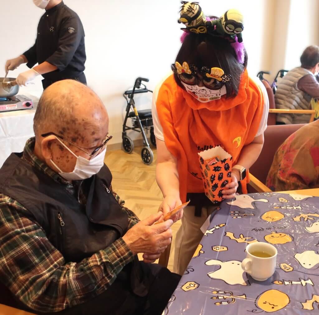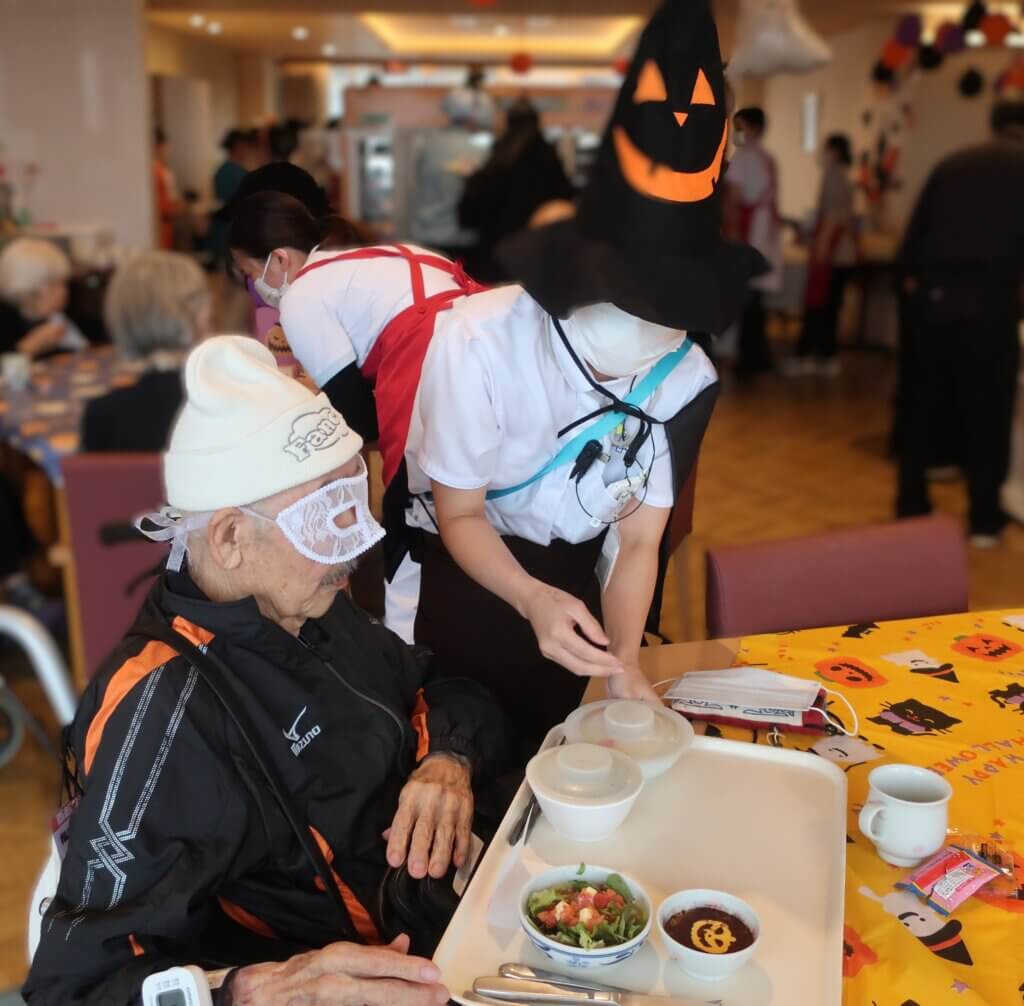 今年は特別に、桜十字病院のお食事部よりLive kitchen形式のハロウィンパーティーランチをご提供。直前までシークレットで進め、仮装したスタッフがお迎えに伺うと、驚きと笑顔があふれる温かな空気に包まれました。