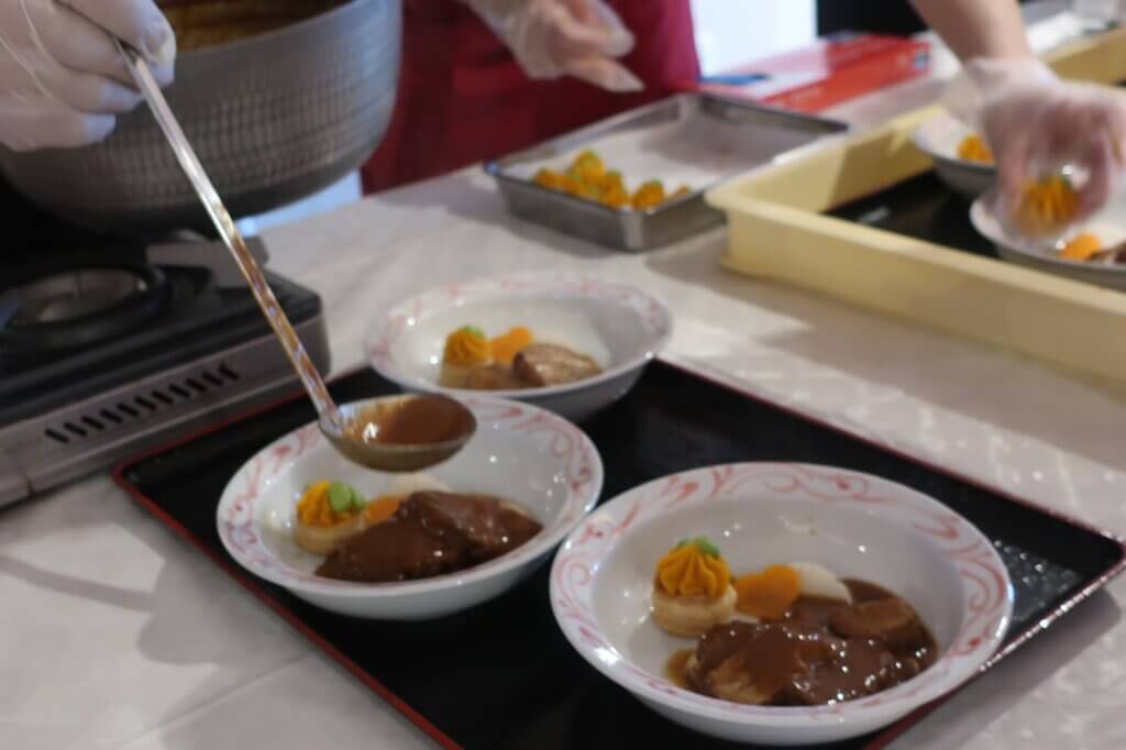メインの牛バラ肉のデミグラス煮込みは、調理人と栄養士が息を合わせて盛り付けるLiveスタイル。湯気の向こうにふわりと広がる香りと、温かさをまとった一皿に、秋色を映す南瓜のパイとハート型の人参が華を添えました。分厚いのに驚くほど柔らかく煮込まれた牛バラ肉は、丁寧にデミグラスで仕上げたビストロ風の味わいで、見た瞬間から「これは美味しいに違いない」と思わせる、期待感たっぷりの一皿です。