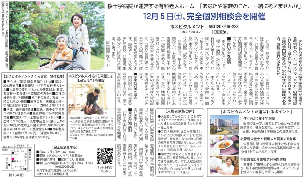 2020.11.23 お知らせ ホスピタルメント個別相談会のお知らせ ホスピタルメント個別相談会のお知らせ 【日時】2020年12月5日(土)10:00~16:00 【対象施設】ホスピタルメント全棟(要予約) 桜十字/さくら東館/さくら西館/さくら西館PLUS