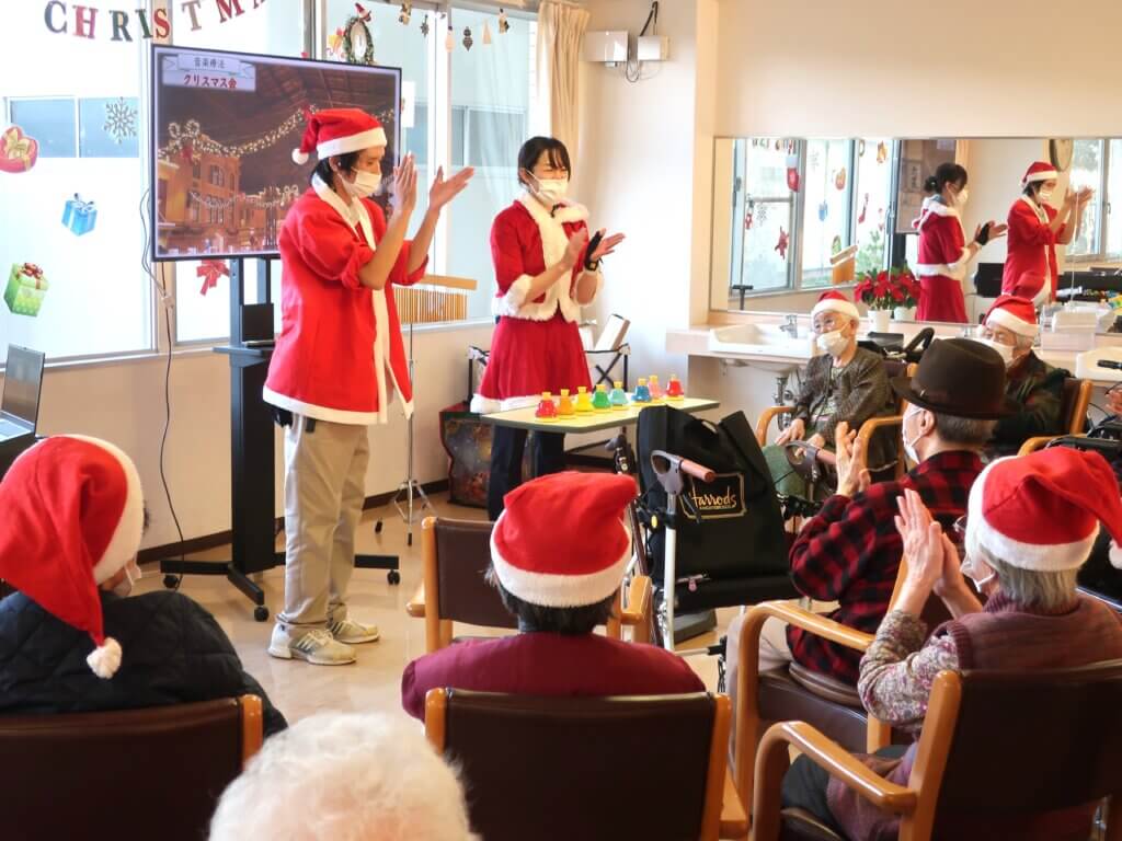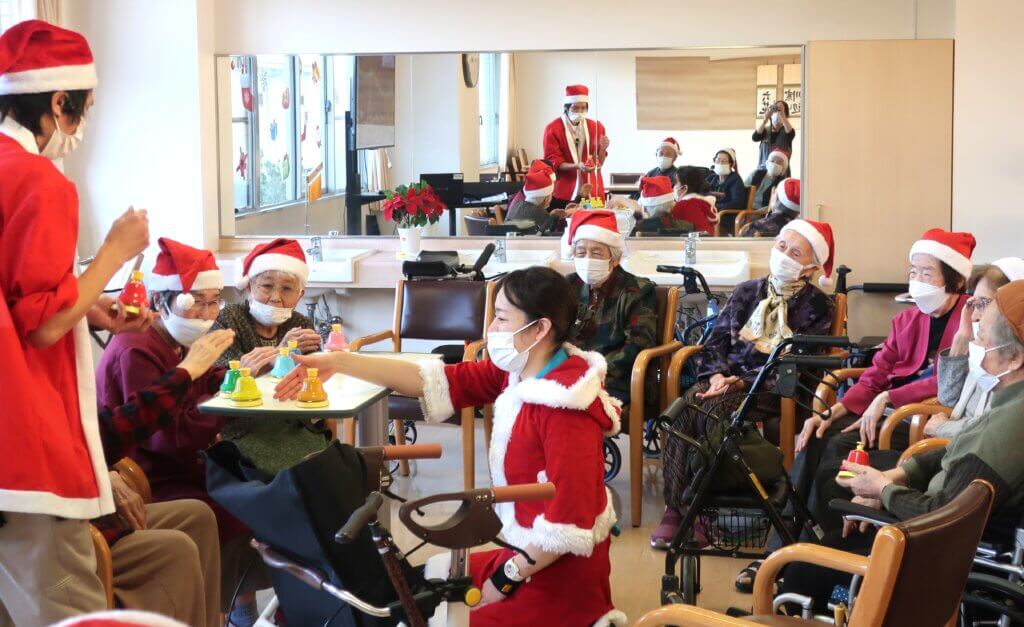 音楽療法士の伴奏に合わせて、ジングルベルや赤鼻のトナカイなどを合唱し、鈴を手に、それぞれ音を鳴らしながら、体を動かし楽しまれました。