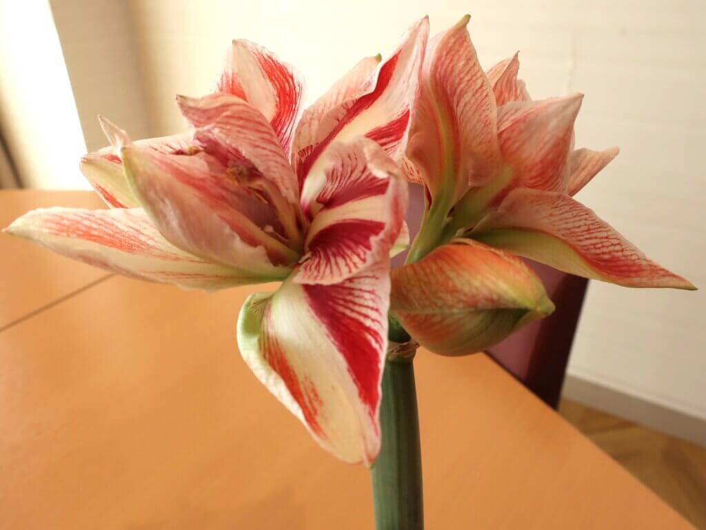 球根だったアマリリスがご入居者様のお部屋で立派に開花し、スタッフ一同「すごいですね♪」と声を交わしながら、喜びを分かち合いました。