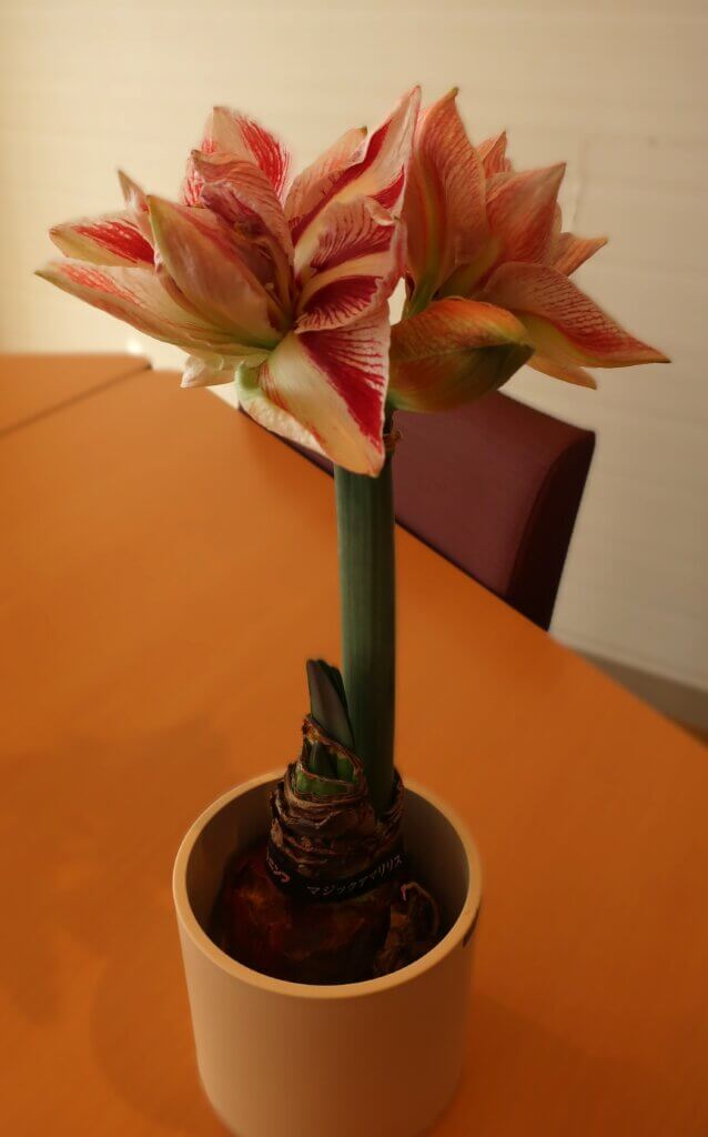 そうお声掛けくださり、ご入居者様が事務所に持って来てくださったのは、見事に花を咲かせたマジックアマリリスでした。