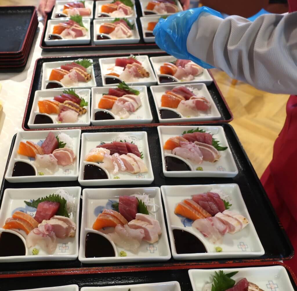 桜十字病院の料理人が一皿一皿丁寧に広げ、醤油とわさびを添えて整えていきます。