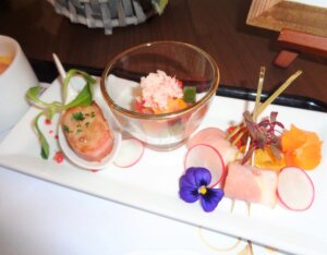 「オードブルの盛合せ」には、合鴨、蟹、帆立を。