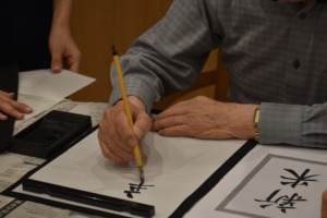 お手本を見ながら「なんだか下の字が小さくなるわね」「久しぶりに書くと難しいね」と和やかにお話しされつつ、皆さま真剣な面持ちで筆を取られていました。