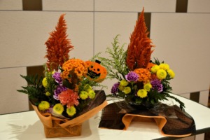 今月のフラワーアレンジメントは、ハロウィンを意識した明るいオレンジ色がテーマ。カーネーションや久留米ケイトウ、スプレーマムなど、秋の装いにぴったりなお花を組み合わせ、テーブルの上が一気に華やぎました。