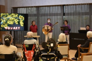 本日、港ハーモニー」の皆さまをお迎えし、「秋の歌会」を開催いたしました。ギターやピアノの優しい音色に包まれ、「四季の歌」「里の秋」「旅愁」「いい日旅立ち」「古城」「夢淡き東京」など、秋の情景が浮かぶ名曲の数々を披露してくださいました。
