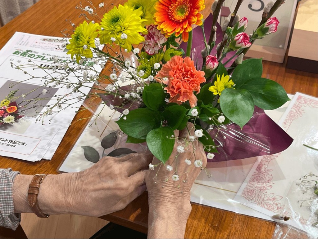 制作中は、「明るい色で元気がでるね」「やっぱりお花は良いね」といったお声が聞かれ、皆さま表情も自然と明るくなっていらっしゃいました。