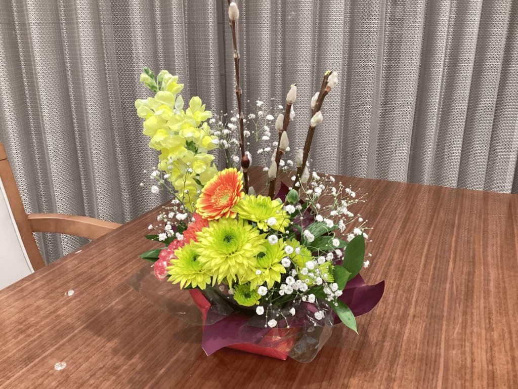 本日、毎月恒例のフラワーアレンジメントを開催しました。
