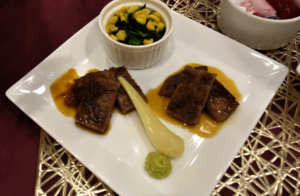 やわらかく焼き上げたサーロインは、帝国ホテル発祥のシャリアピンソースと、伝統のグレイビーソースの二種で。上品な甘みと深みのある旨味が広がり、「やはりお肉は嬉しいですね」「ソースの違いが楽しい」と、自然と会話も弾みました。