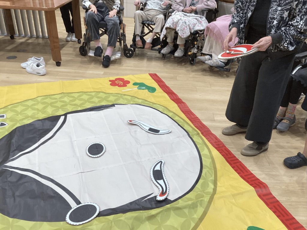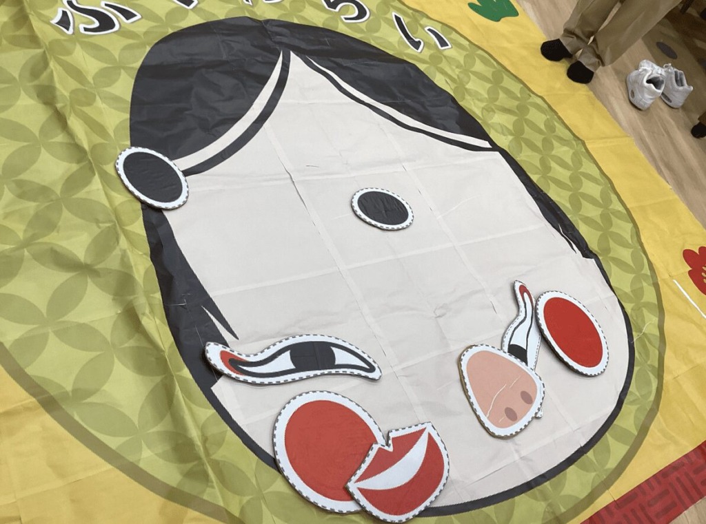 床いっぱいに広げられた大きなお顔に、目や口などのパーツを投げていただくという、少し趣向を凝らした福笑いです。