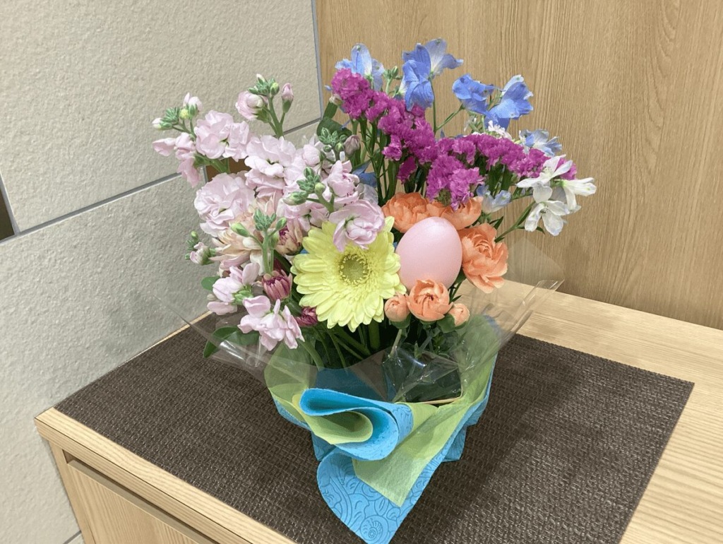 今回は「イースター」をテーマに、ガーベラやスプレーカーネーション、スプレーデルフィニウム、フリージアなど、春を感じさせる花材をご用意いたしました。