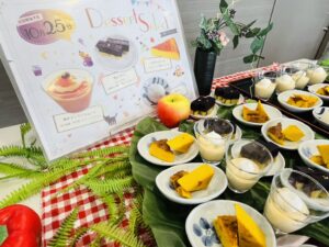 2022.10.25 イベント 【デザートセレクト】を開催いたしました 本日、毎月恒例イベントのデザートセレクトが開催されました。 今月は紫芋の芋ようかん、柿のティラミスムース、かぼちゃのケーキと栗大福と4種類をご用意。 彩りも鮮やかなデザートに「どれも美味しそうで1つを選べないな」「毎回きれいに作ってあってすごくおいしいね」と皆様にお喜びいただけたようです。 日々のお食事をより楽しんで召し上がっていただけるような催しを企画してまいります。