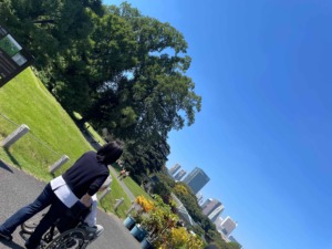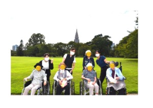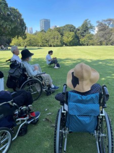 見学の後は芝生で休憩。皆さま「こうやって外の空気を吸うのはやっぱり気持ちいいね」「来てよかったわ」と広々とした空間でリラックスされて自然の美しさを感じたりすることで、心も身体もリフレッシュしていただきました!