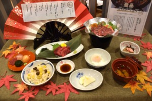 黒火乃牛のすき焼きをはじめ、本鮪のお刺身、秋の栗、さつまいも、銀杏、紅葉人参など、色鮮やかな秋の食材がたっぷり使用した御飯。松茸のお吸い物はふわっと漂う松茸の上品な香りに、皆さま「わあ〜!」と歓声が。