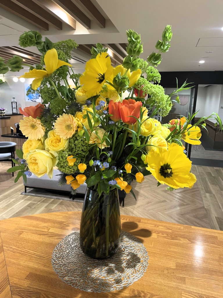 やわらかな色合いが美しいチューリップ。オレンジ色のベルのような明るく元気なお花が可愛らしいサンダーソニア。上品な存在感のバラが全体を引き締め、可憐なワスレナグサがそっと寄り添うように彩りを添えています。受付に立ち寄られたご入居者様やご家族様からも「春らしくて素敵ね」「元気が出る色合いね」と嬉しいお声をいただいています。春らしさあふれる華やかな受付のお花です♡
