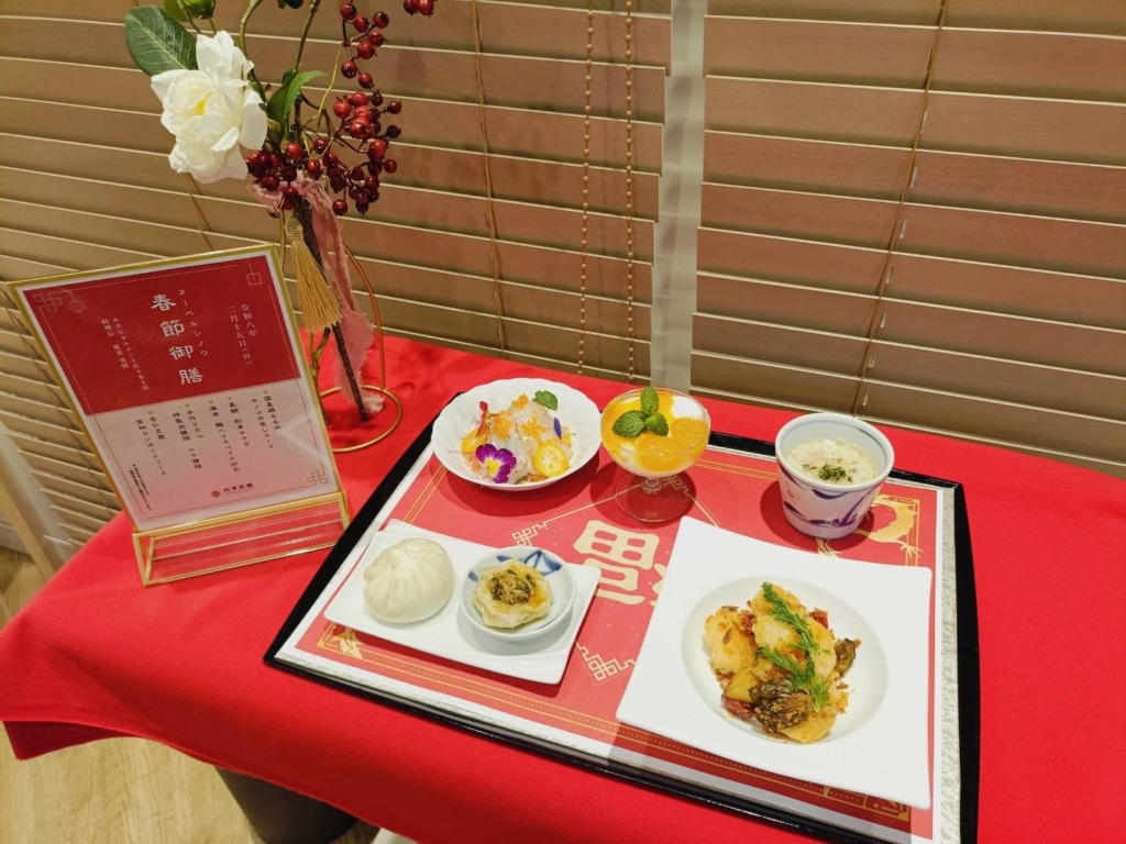春節は中国の旧正月を祝う大切な行事で、家族の健康や幸せを願う日です。今回はお食事だけでなく、春節の飾りや敷紙を取り入れ、季節感を感じていただける空間づくりを行いました。
