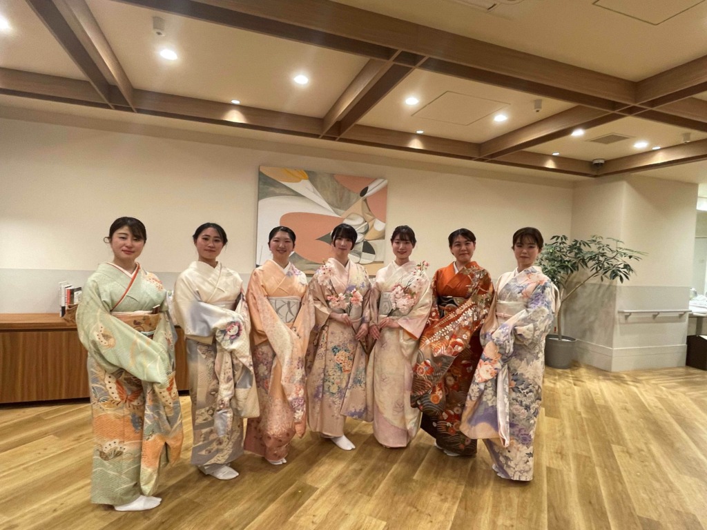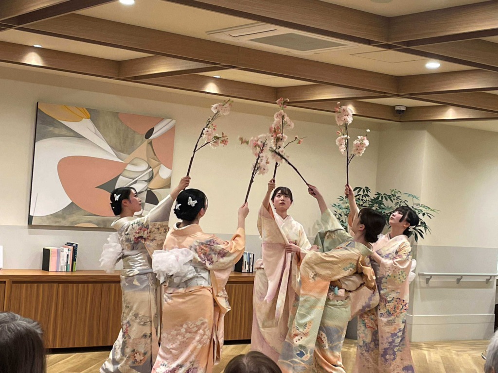 イベント終了後には、学生の皆さまとご入居者の皆さまが言葉を交わし写真撮影。心温まる交流の時間となり、日本舞踊の魅力を改めて感じるひとときとなりました。