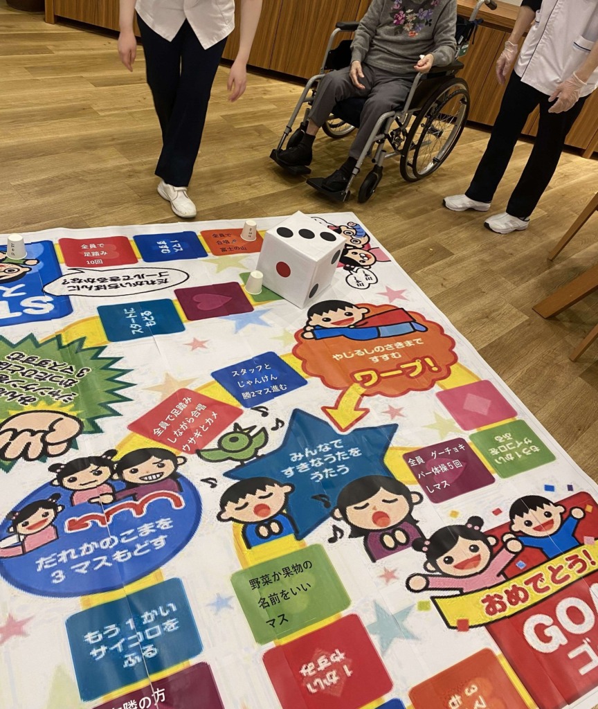 体を動かしたり、大合唱したり、普段はあまりお話されない方も交流し、会話と笑顔があふれました。ジャンボすごろくは、体を動かす、頭を使う、といった要素がバランスよく含まれており、楽しみながら心身の活性化につながります。「またやりたい!」とたくさんお声をいただいたのでレクリエーションに取りいれていきます!
