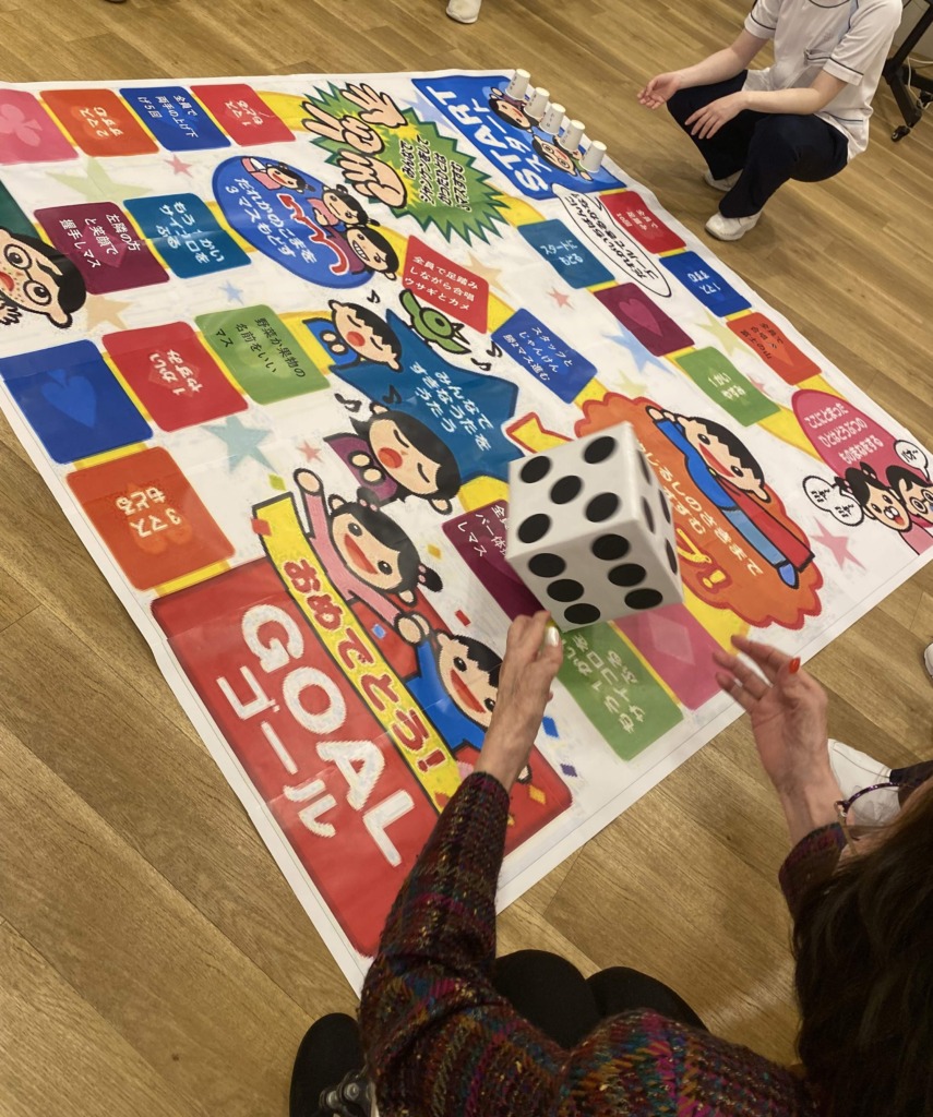 体を動かしたり、大合唱したり、普段はあまりお話されない方も交流し、会話と笑顔があふれました。ジャンボすごろくは、体を動かす、頭を使う、といった要素がバランスよく含まれており、楽しみながら心身の活性化につながります。「またやりたい!」とたくさんお声をいただいたのでレクリエーションに取りいれていきます!