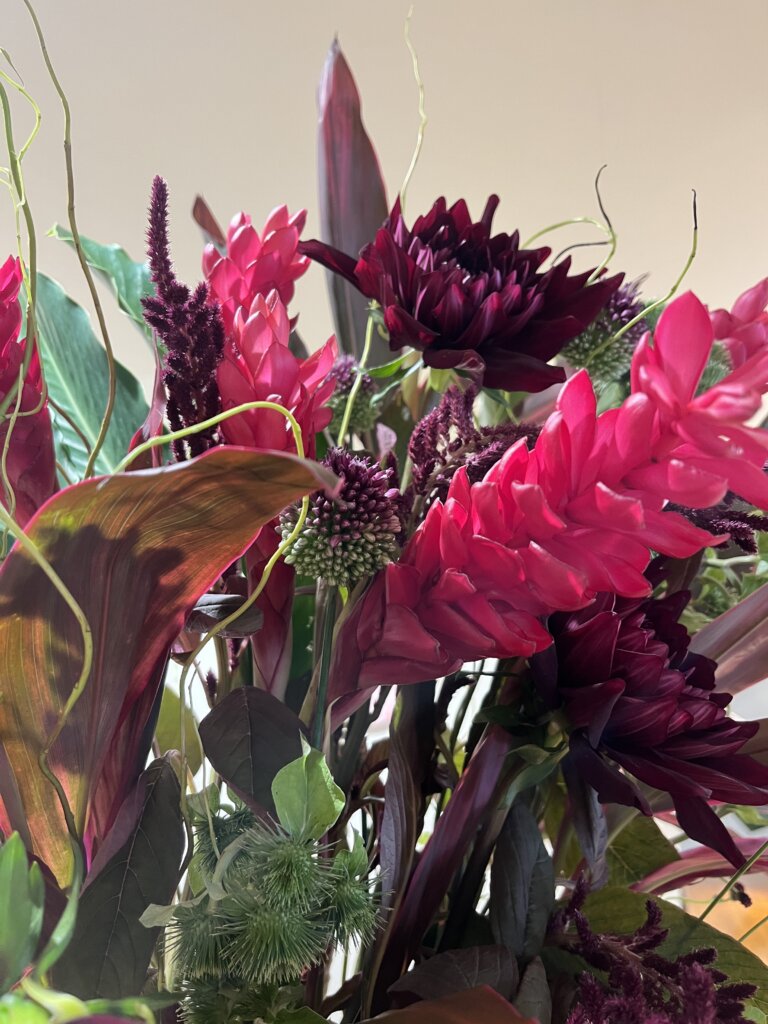 花芯の部分が赤黒色、外側に向かうに赤色へと